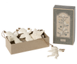 A perfect gift box containing 4 beautiful Maileg ornaments. Each ornament is wrapped in tissue paper and packed in a gift box decorated with Dorte Mailil's drawings. This set contains 3 different angels and a star.
