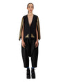 This short cape features a v-shaped neckline, curved sleeves and two front pockets. It is designed with leather fretwork details on the sleeves and pockets.