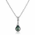 The necklace features a one-of-a-kind Tahitian pearl with sterling silver accents. The pendant hangs from a sterling silver rolo chain.