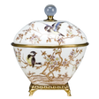 The Round Bird Box features several hand-painted birds perching atop floral vines. The box's lid features a clear glass orb handle, while the box's ormolu accents compliment the birds' colorful detailing.