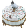 The Scalloped Bird Box features a peaceful blue bird perching atop a bronze branch.  The box's lid features a Garden of Life floral theme, while the box's ormolu accents compliment the light blues and pops of pink.