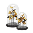 A gorgeous array of wings midflight delight the eye in the Golden Butterflies Cloche. Each butterfly is made of hand-painted gold feathers on the top and black on the bottom giving off such an elegant look.