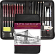 This attractive, portable, all-in-one 40-Piece Travel Sketch Kit lets you draw anytime, anywhere! The complete professional drawing and sketching art set includes every tool you need to create amazing sketches. Set includes 12 graphite pencils, 3 graphite sticks, 1 woodless soft graphite pencil, 1 plastic/vinyl pencil eraser, 1 pencil extender, 3 charcoal pencils, 3 charcoal sticks, 4 charcoal willow sticks, and 1 kneaded charcoal eraser. Case also includes 4 pastel pencils, 2 paper blending stumps, 1 dual-tipped rubber blender, 1 plastic sharpener, 1 two-hole sharpener, and 1 sandpaper block.