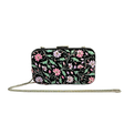 Expertly hand-embroidered by third generation zardozi artisans, this black velvet designer hard case clutch features soft pink and lavender flowers. Each flower and leaf is meticulously outlined in sparkly metallic thread and embellished with genuine rubies to create an opulent dazzling 3D effect. The fully-lined clutch has a push lock closure and one interior slit pocket.