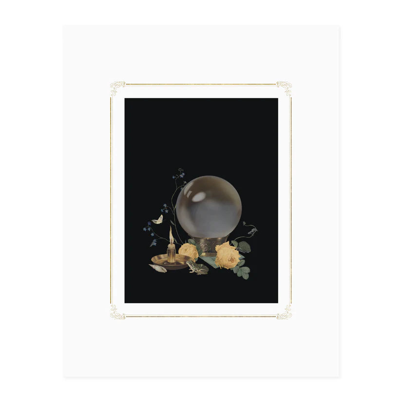 Peer into the unknown with the Crystal Ball Print. This enchanting artwork features a detailed illustration of a crystal ball, adorned with shimmering gold foil accents that catch the light and captivate the eye. This piece brings a touch of mysticism and elegance to any space. Whether displayed in your home or gifted to a fellow seeker of the arcane, it serves as a reminder of the mysteries that lie just beyond the veil.