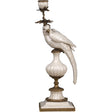 This glazed and crackled porcelain candle stick holder features a white parrot sitting atop a multi-shaped, multi-tiered bronze and porcelain pedestal. The proud parrot supports the blooming bronze candlestick holder.