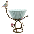 This scalloped light blue bowl is held aloft with bronze vines, and decorated with hand-painted porcelain flowers. A beautiful hand-painted bird sits atop a vine, perched as if singing to the sky above.