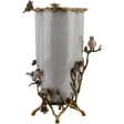 This porcelain vase features hand-painted birds delicately perched upon bronze branches.