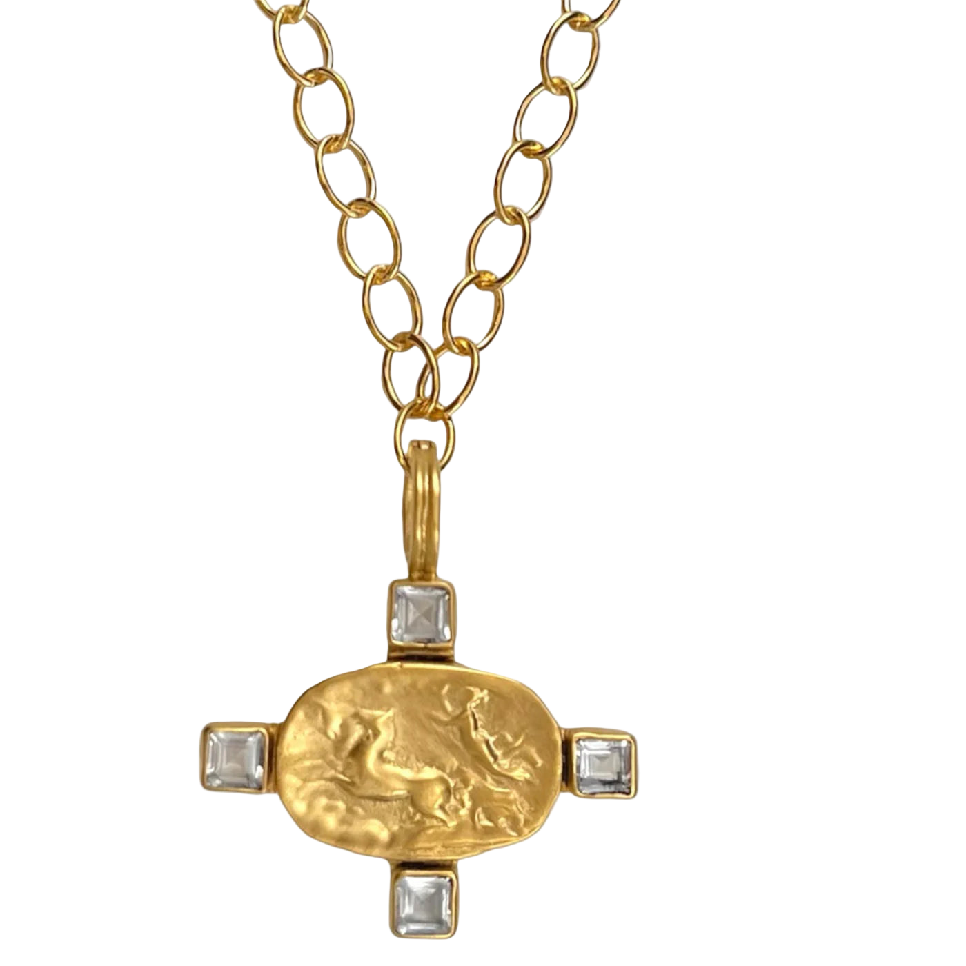 The incredible detail on this necklace depicts the celestial god, Helios, and his horse drawn chariot drawing the sun daily across the heavens. The necklace's pendant features four princess-cut topazes.