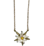 The Edelweiss Pendant Necklace is cast in hand patinated bronze, accented with 22k white gold leaf and an Austrian crystal center set in 24k gold plate.