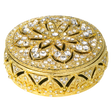 The Gold Windsor Round Box features a classic estate jewelry inspired design. The Windsor Round Box is made of gold-finished pewter and encrusted with hand-set clear European crystals with a cladon hand-enameled interior.