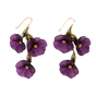 The Petunia Statement Earrings are cast in hand patinated bronze with deep purple cast glass flowers and a 24kt gold plated center. The wires are 925 silver with a 24kt gold plating.