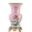 This hand-painted garden vase features a bird taking flight from a floral branch. The vase is accented with bronze ormolu accents at the rim and the bottom.