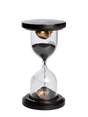 This elegant black wood hourglass is adorned with two gold skulls and fine black sand.